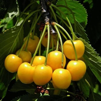 Плоды черешни Дрогана Желтая имеют эффектный внешний вид и выделяются своим насыщенным желтым окрасом. Ягоды выше среднего размера, их вес достигает 8 грамм, а сердцевидная форма делает их особенно привлекательными. Очень тонкая и гладкая кожица скрывает сочную мякоть плотной консистенции желто-соломенного цвета. Вкус ягод запоминающийся – гармоничный и очень сладкий, без кислинки. Прозрачный сок подчеркивает чистоту вкуса. Созревание позднее, приходится на июль, и происходит одновременно. Средняя урожайность взрослого дерева составляет 50-70 кг, а при благоприятных условиях может достигать 100 кг.